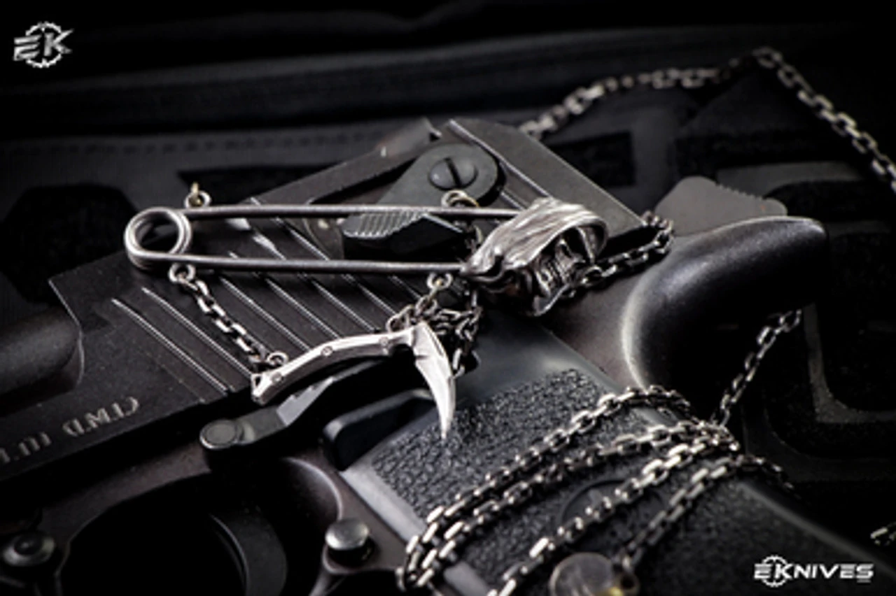 Bastinelli Knives Custom Long Silver Reaper Safety Pin Necklace 36″ Chain