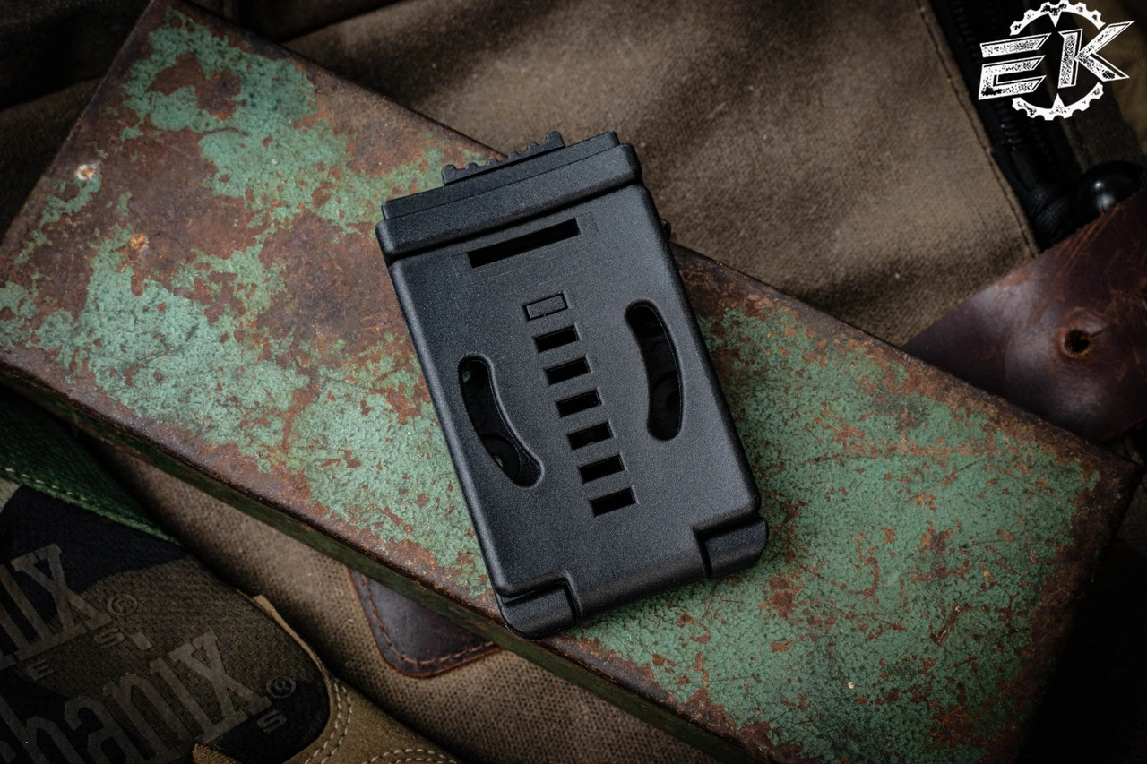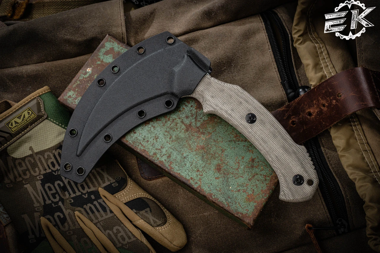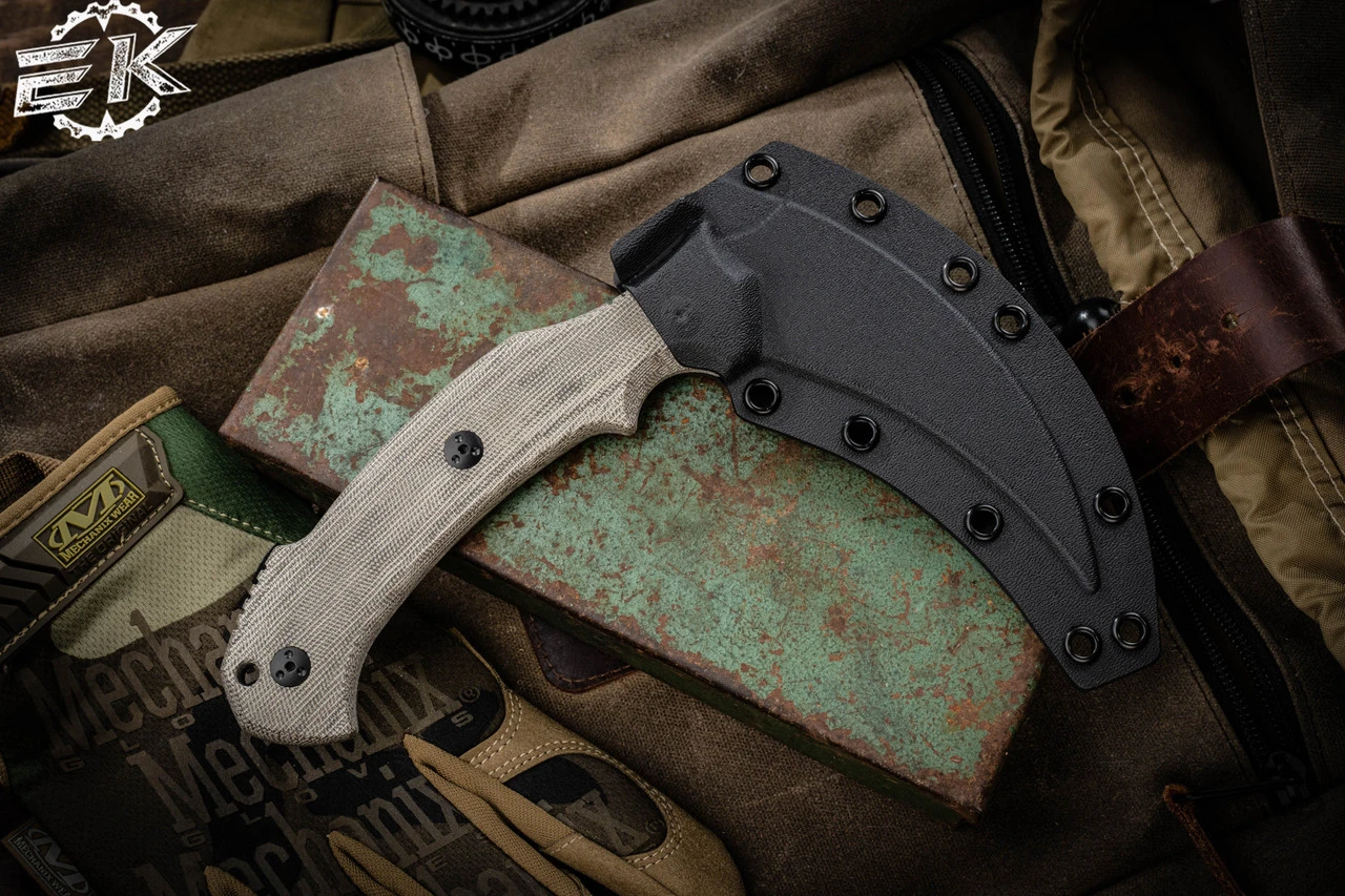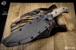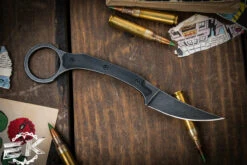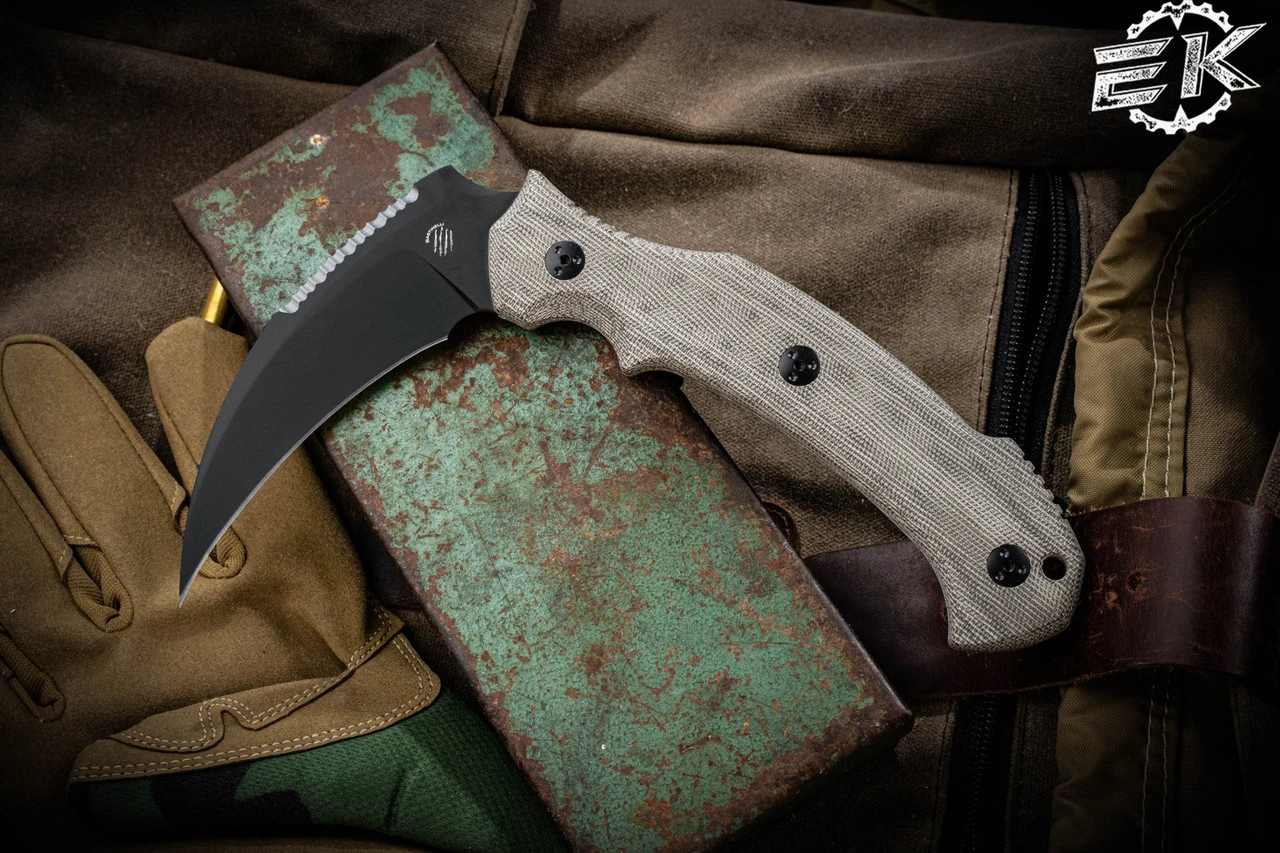 - Blade: 4″ N690CO, Black, Serrated Spine