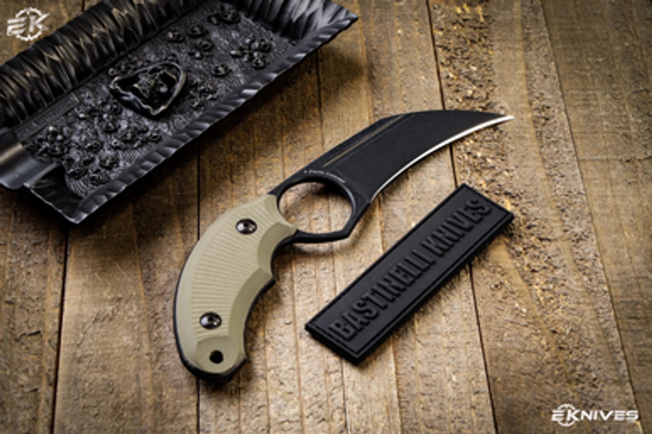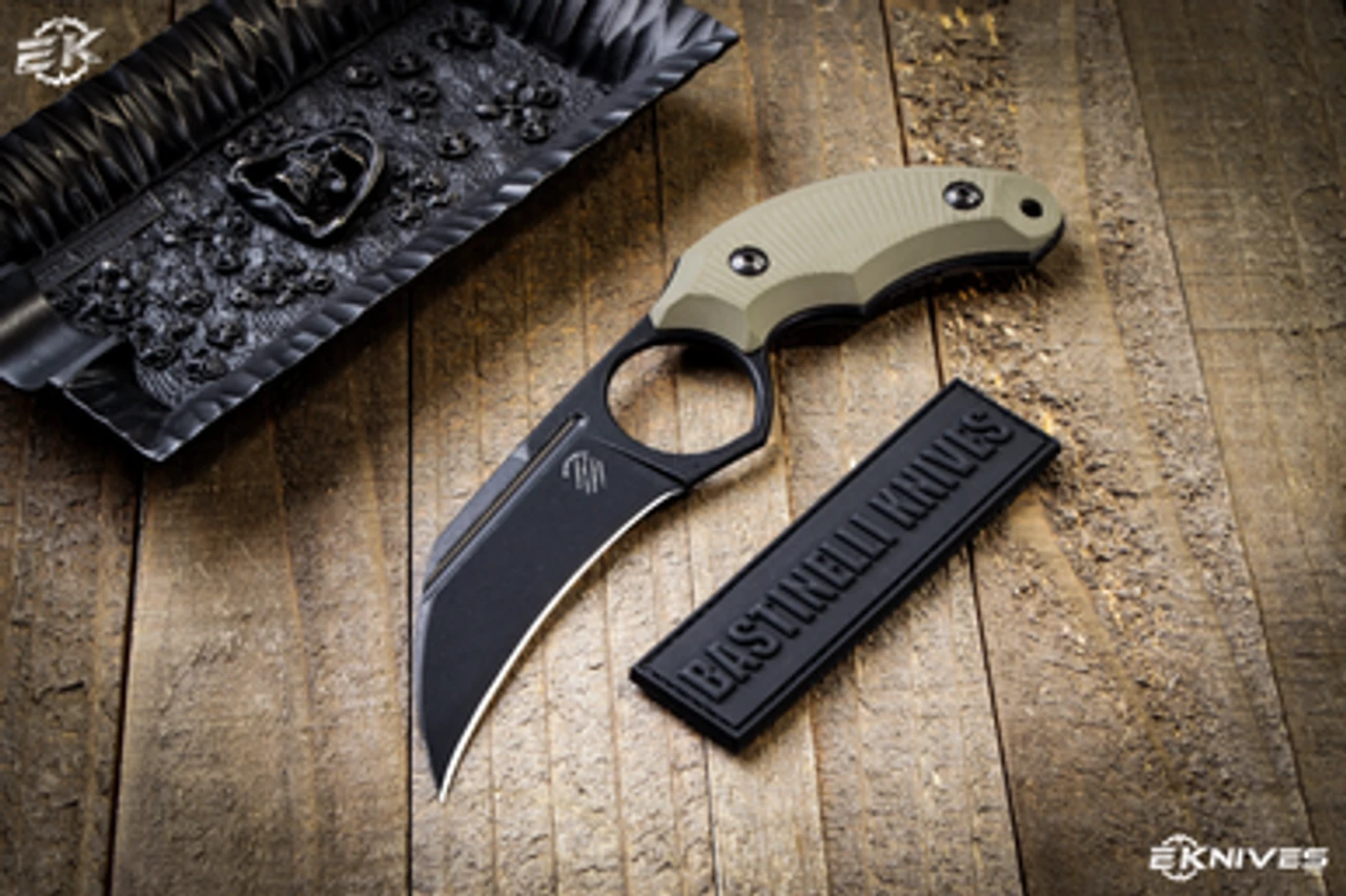This Bastinelli Creations Harpy fixed blade delivers ultra tactical performance in a Karambit style blade designed by legendary maker Fred Perrin. This model is comprised of a G-10 handle and black stonewash Bohler N690 stainless steel blade. The contoured handle fits in the hand perfectly in regular and reverse grip. Includes a fitted kydex sheath with a stainless steel belt clip.