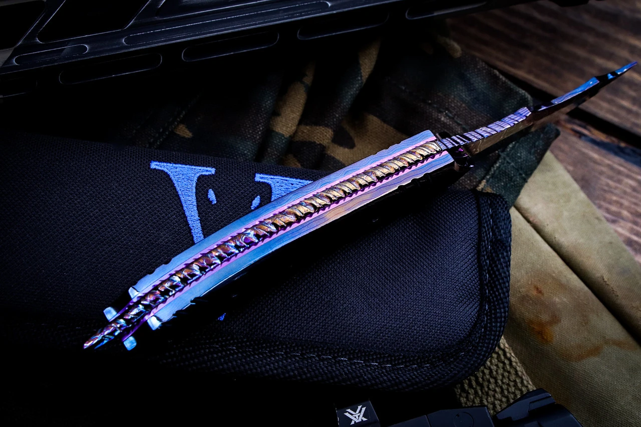 Brandon Vallotton Custom “Thorn” Ladder Damascus Handle, Intrepid Hot Blued Damascus
