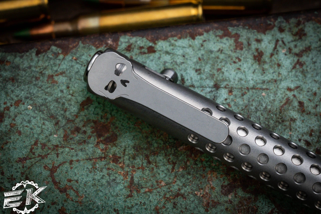 Completing the design is the signature skull pocket clip, a trademark of Chaves Knives. This skull clip not only adds a touch of personality but also serves as a practical feature, securely attaching the pen to your pocket or notebook for easy access.