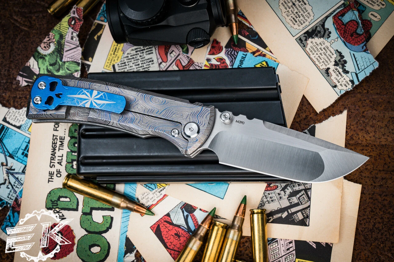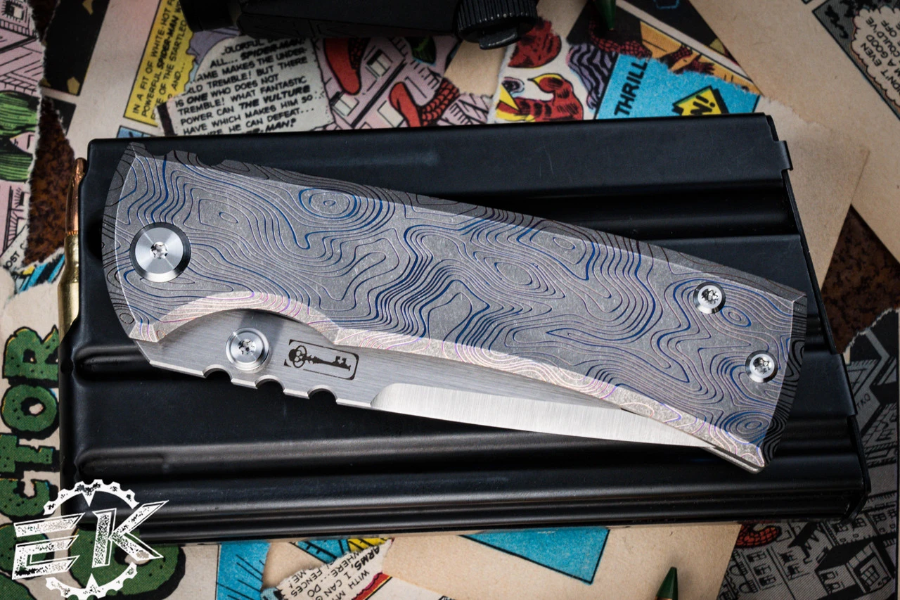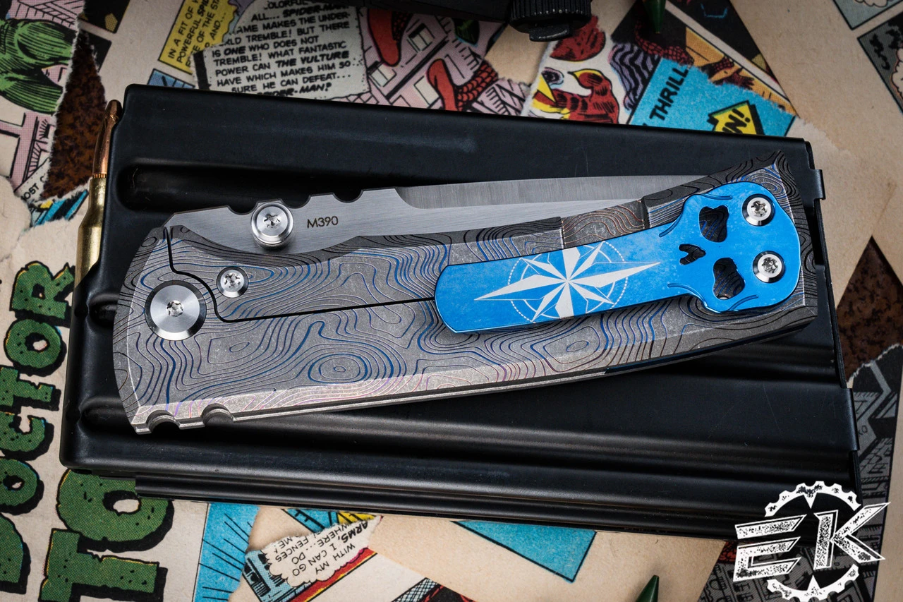 Introducing the sleek and stylish 7.5” knife designed by Ramon Chavez and customized by Ben Davis. The knife features a 3.25” M390 Drop Point blade with a machine satin finish and dual thumb studs for easy deployment. The handle is crafted from titanium with a blue anodized finish and a unique Topographic pattern that’s been laser engraved. To complete the look, the knife comes with a titanium pocket clip shaped like a skull and anodized for added durability. Whether you’re an avid collector or looking for a reliable tool, this knife is a must-have. Made in China by Reate Knives, this knife offers premium quality at an affordable price.