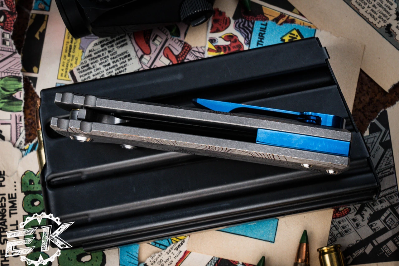 - Handle: 4.25″ Titanium, Blue Anodized w/ Topo Pattern Laser