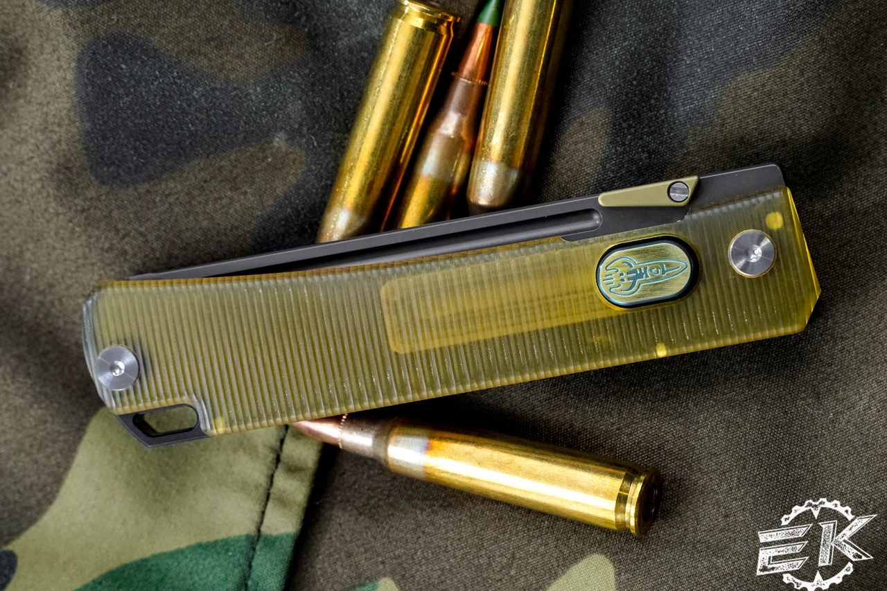 Contoured ULTEM handles with VG-10 Blade, The blade comes in DLC Black or Satin.