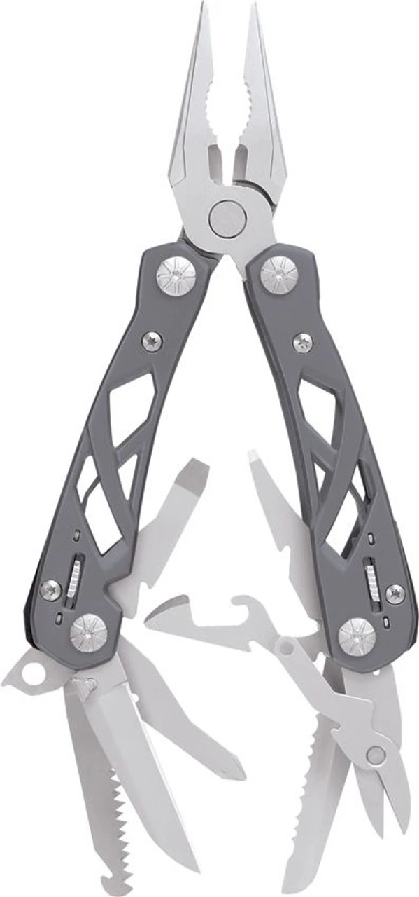 4″ closed. Stainless open style frame. Features spring-loaded needlenose pliers; serrated sheepsfoot blade; drop point blade; can opener; large, small and Phillips screwdrivers; scissors; saw and lanyard tab. SAF-T Plus component locking system. Black ballistic nylon belt sheath