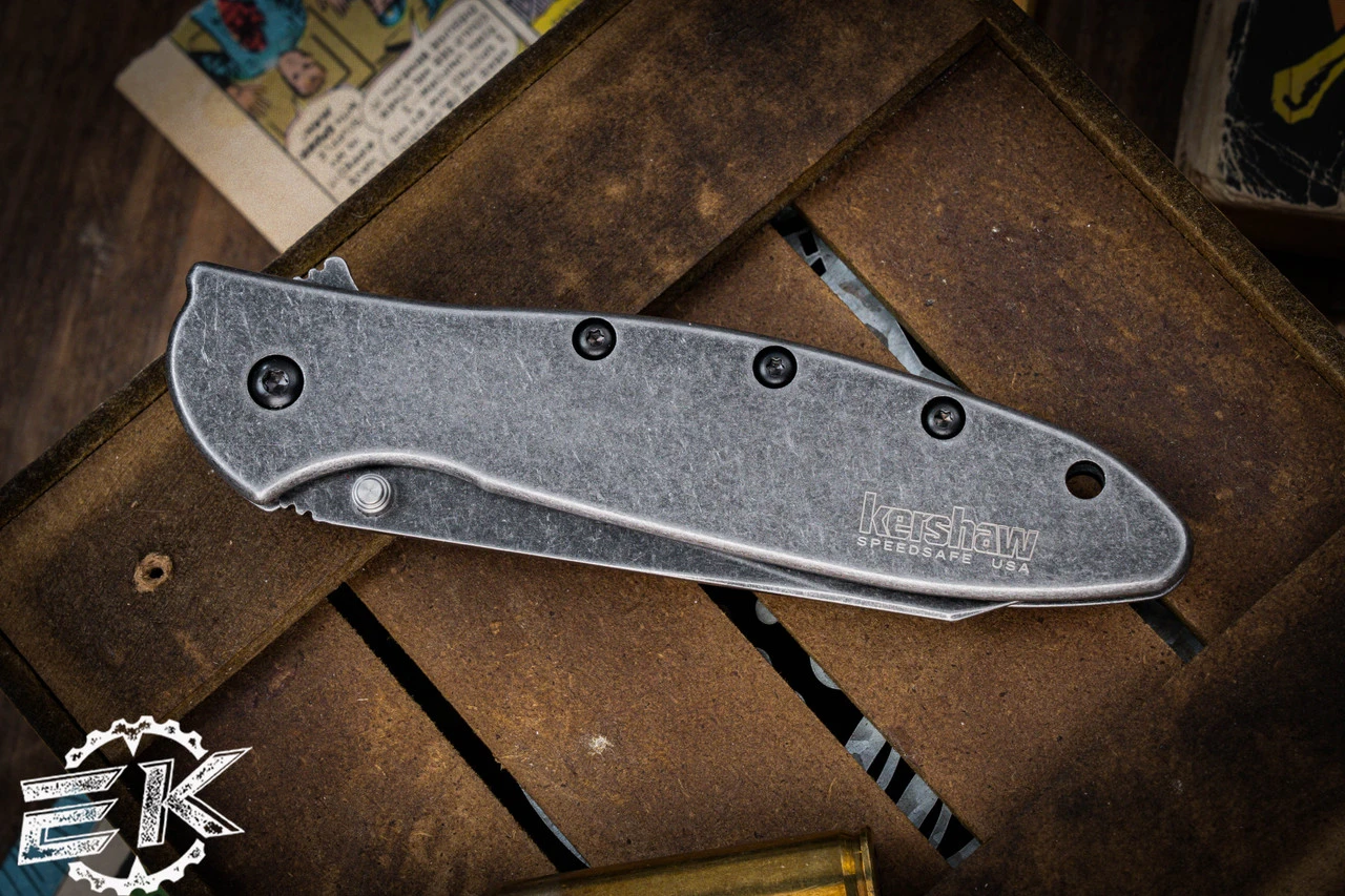 The famous Kershaw Leek just got better—with our BlackWash finish that gives this Leek an already-broken-in look, like your favorite pair of well-worn jeans. With its 3-inch blade, the Leek is a good-sized knife, but not too big. The slim design makes it easy to carry and its razor-sharp blade of high-performance Sandvik 14C28N means it can take care of a full range of cutting tasks—from slicing to piercing to detail work. BlackWash™ finish gives this Leek a unique look, helps hide use scratches; Made in the USA Sandvik 14C28N high-performance stainless steel blade holds its edge, resharpens easily All stainless steel handle is durable; BlackWash finish matches blade SpeedSafe® assisted opening with convenient flipper