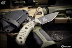 Bastinelli Knives “Grumpy” OD Green Micarta Black/Tan Tsuka Wrap Scythe 4″ Black Serrated Spine