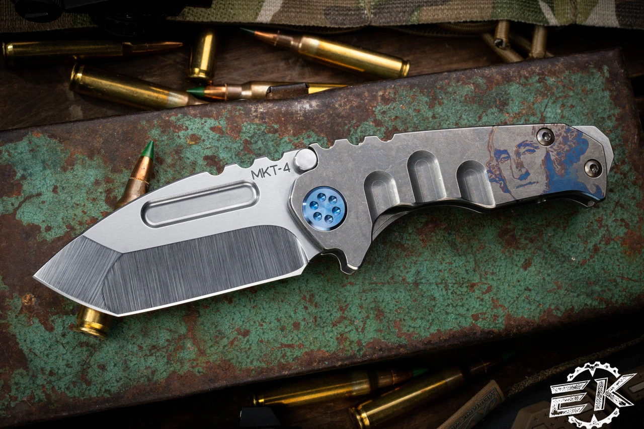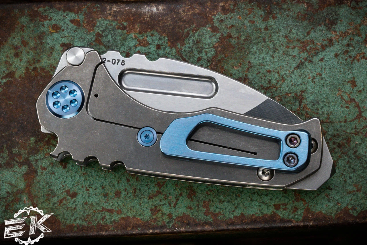 Introducing the Micro Praetorian “T” – a smaller yet chunky folding knife with the same nasty grip and punch as its larger counterpart. Measuring 6.75″ overall, this knife features a 2.875″ S45VN tumbled tanto blade with a manual thumb groove for easy opening. The handle is crafted from 3.875″ titanium and laser engraved with an iconic “George Washington” design. The spring and lockside are also tumbled titanium, while the hardware and clip are made of titanium in a stylish blue finish. The breaker is coated in NP3 for added durability.