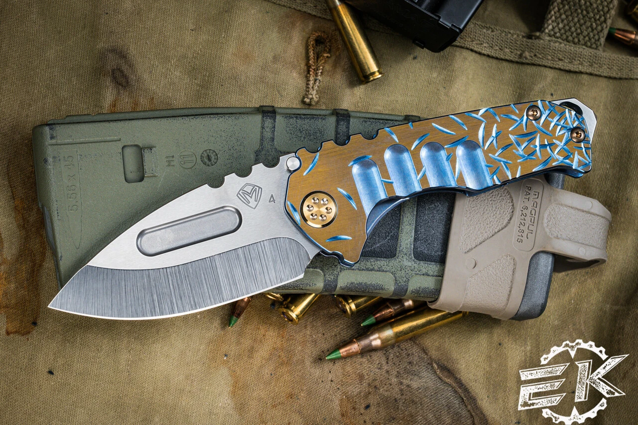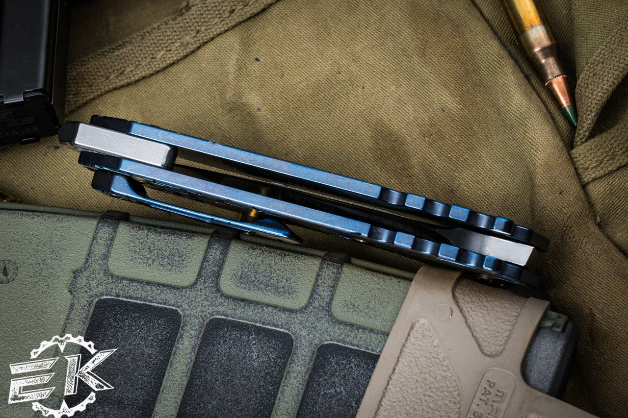 - Handle: 4.35″ Sculpted Blue Titanium w/ Bronze “Jasmine Fade”