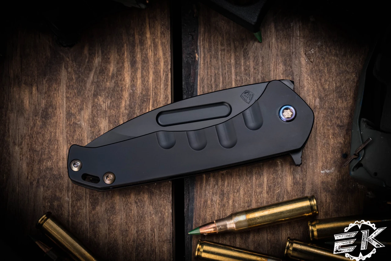 This knife has all the sexy appeal of the standard “Prae Slim” but the action of an auto. The flipper-cam is yummy and well placed for comfort in both the open and closed positions. The blade rides on 18 bearings and has the most satisfying snap both open and closed action. Titanium, S45VN and all American Made.