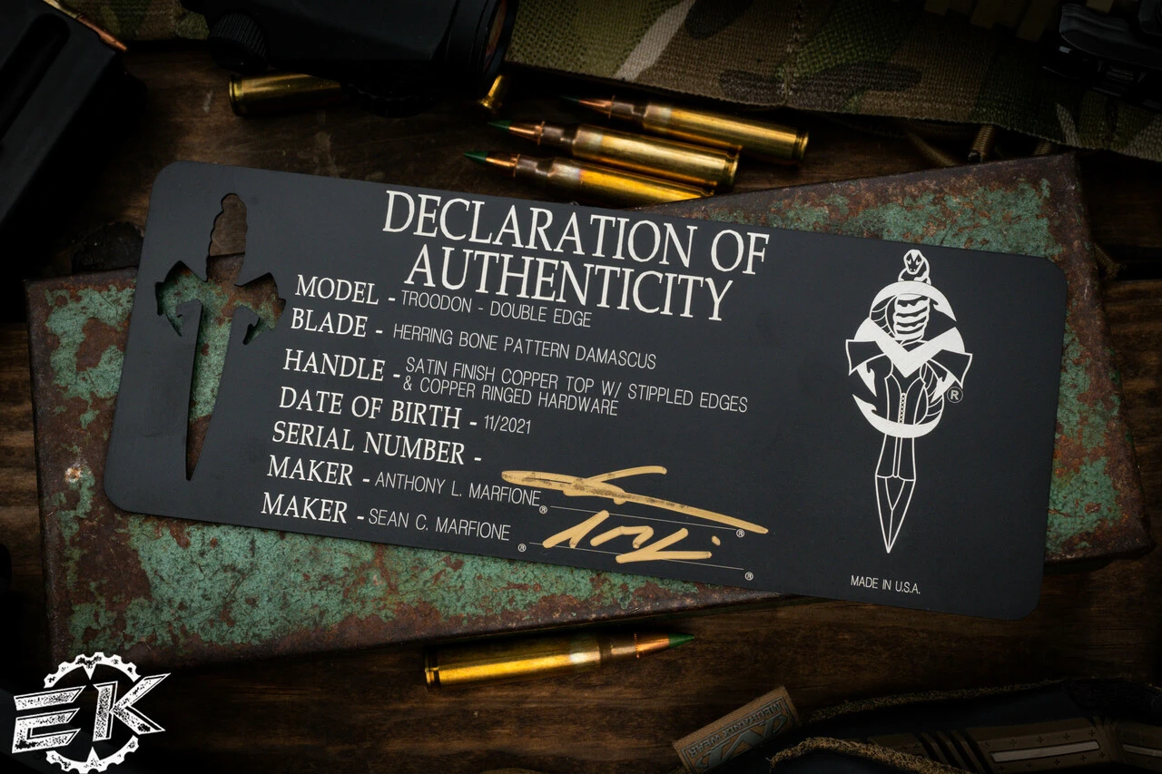 Microtech/Marfione Custom “Troodon” OTF Copper Polished Damascus, Copper Accents