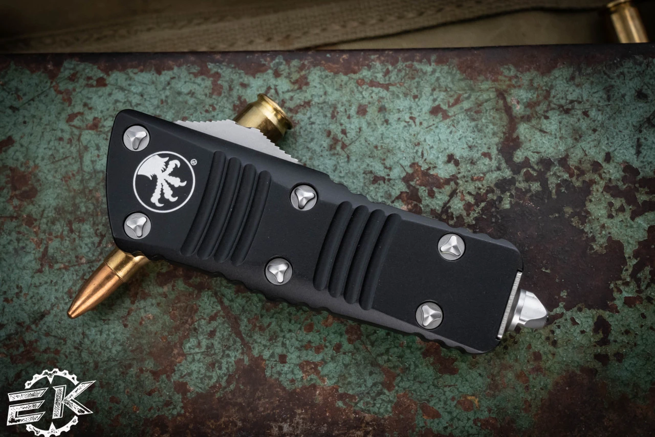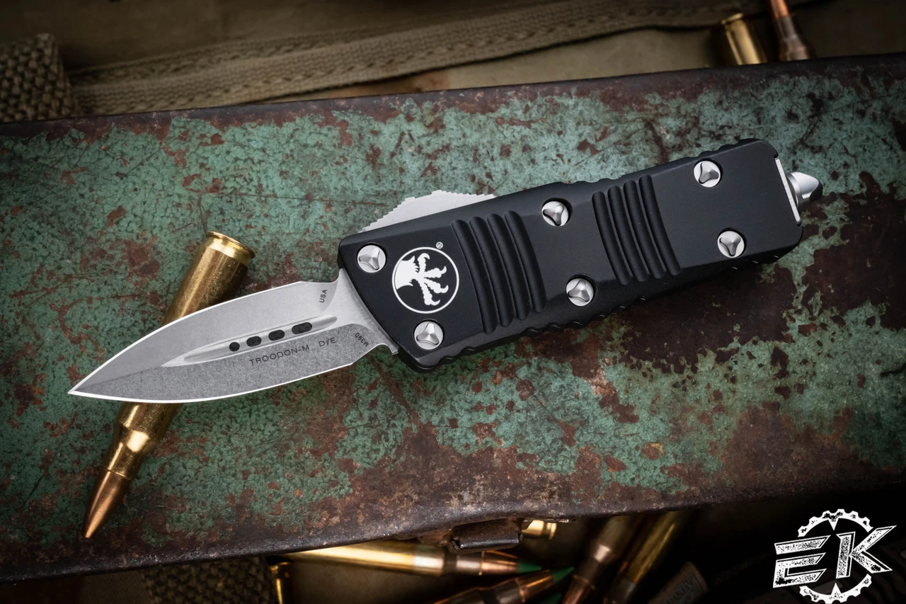 The newest creation Microtech Knives sees the reincarnated version of the Troodon cut down in a California Legal to carry Frame with a blade length just under 2″. The aluminum 6061 T-6 handle is jimped for grip and ergonomically perfect like its bigger sibling.Â