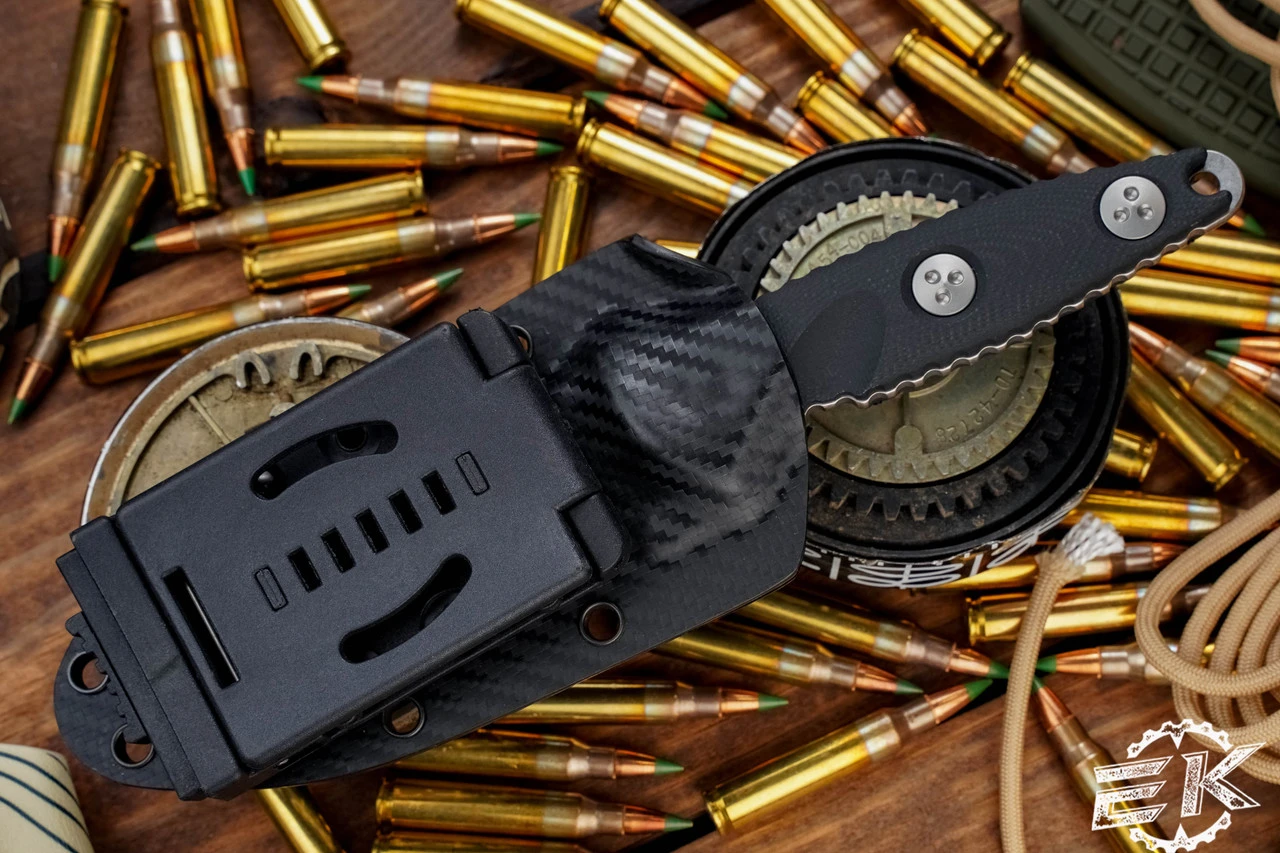 The Microtech Socom Alpha Mini is a fixed blade knife styled after the popular Microtech Socom folder. This fixed blade has a full-tang tanto blade in stonewash finish. The full-tang blade features notches around the edges for a more secure grip. Comes with a Kydex Tek-Lok sheath in laminate carbon fiber.
