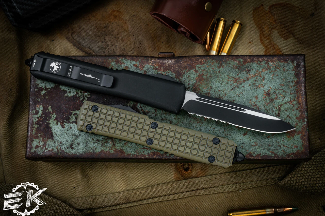 Microtech Ultratech OTF Automatic Knife OD Green 3.4″ Dagger Serrated Bronze Apocalyptic 122-15APOD
