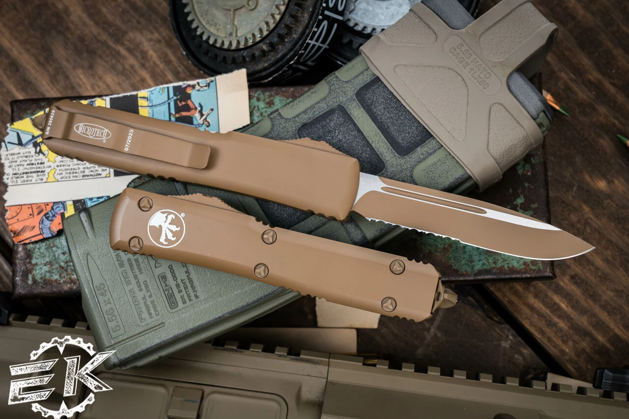 Microtech Ultratech OTF Automatic Knife OD Green 3.4″ Dagger Serrated Bronze Apocalyptic 122-15APOD