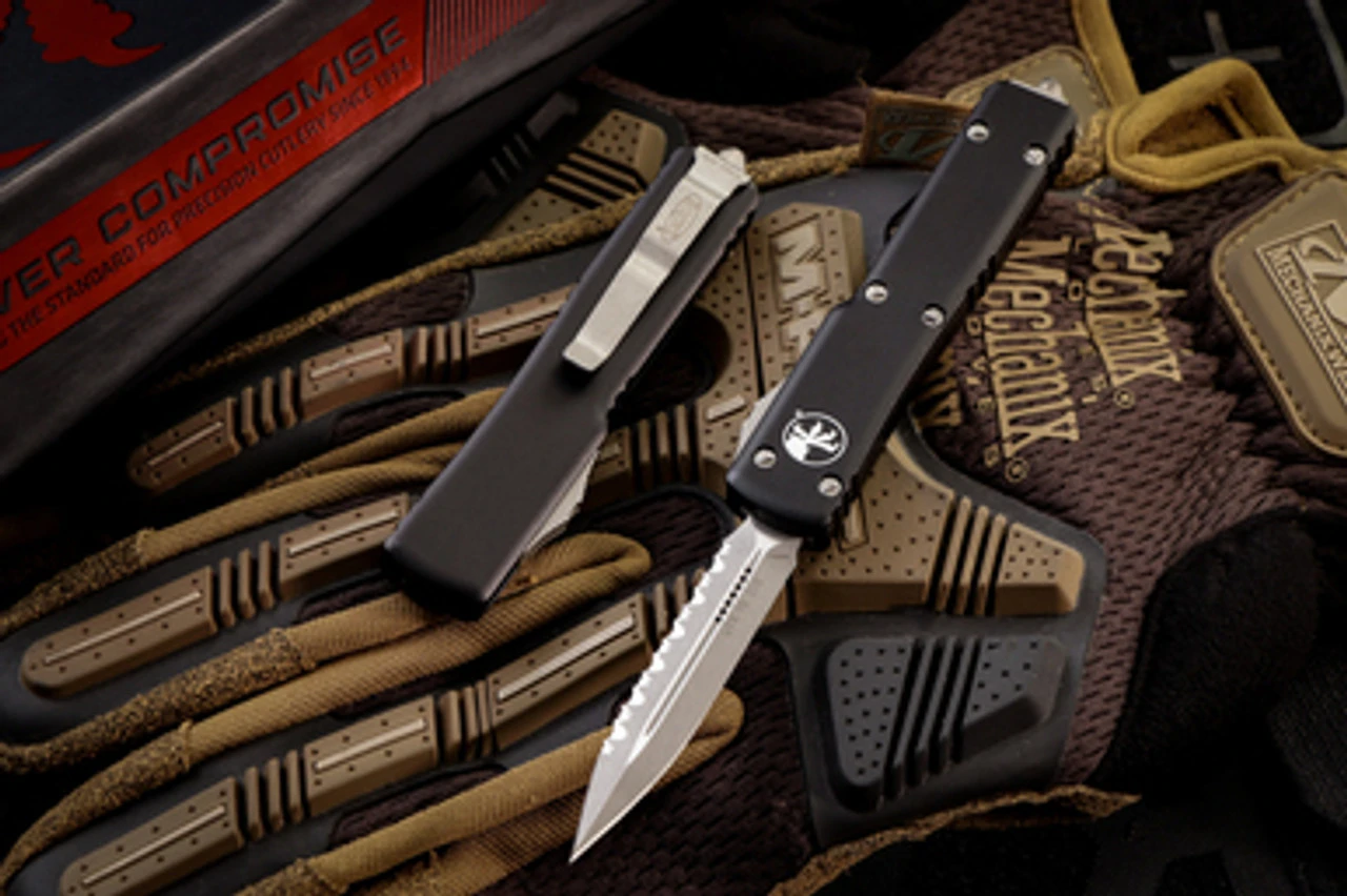 Who said size doesn’t matter? The Microtech UTX-70 is one of the smallest OTF (out the front) automatics on the market. At 70% the size of the Ultratech, Microtech’s first ever OTF knife, the UTX-70 has the same simplistic design and internal spring makeup. The spring remains “at rest” until the blade is deployed ensuring it fires effectively every time. The anodized aluminum handle measures just over 3 inches long and features bead blast hardware, pocket clip and auto firing slide switch on the side. The slide switch deploys and retracts the OTF rapidly with one push making it a perfect EDC OTF knife. The Microtech UTX-70 OTF auto features a 2.4″ double edge with a stonewash finish. The UTX 70 auto is perfect sized for the hand and pocket.