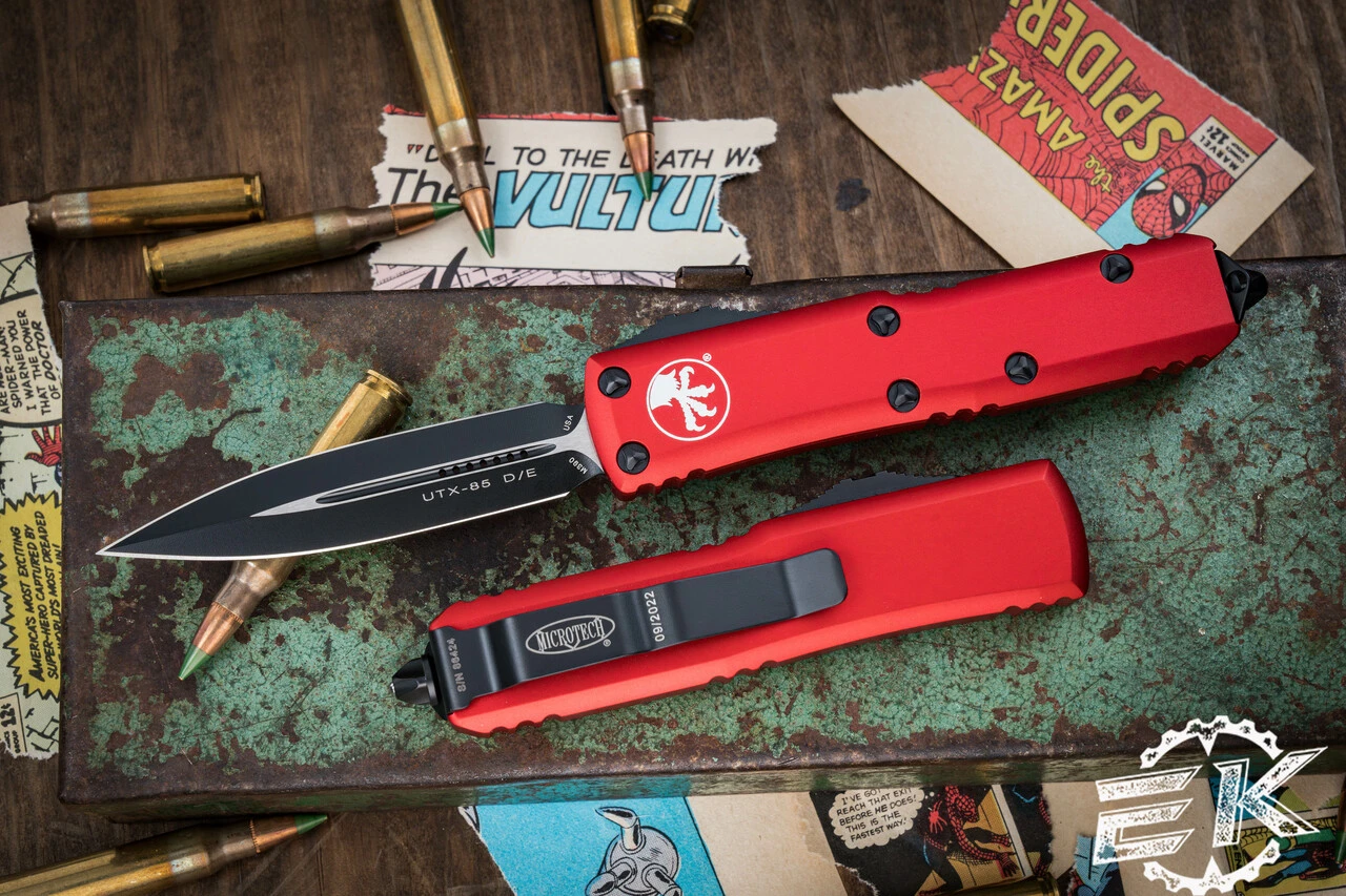 The Microtech UTX-85 out the front knife is a compact pocket friendly auto with functional greatness packaged into Microtech’s stellar design perfected by company owner Anthony Marfione. The UTX 85 comes with a very high quality steel blade and stainless steel hardware including screws, pocket clip and thumb slide for deployment and retraction.