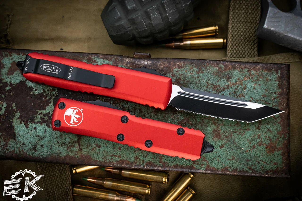 Microtech UTX-85 OTF Automatic Knife Red 3.1″ Tanto Serrated Black 233-3RD