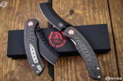 The ‘MURDERED OUT’ version of the Carbon Fiber Satin Edition. This Hell Razor features the Carbon Fiber Handle, an insanely sharp PVD Black Blade, and the same smooth action you have to expect from a Red Horse Knife Work’s product.