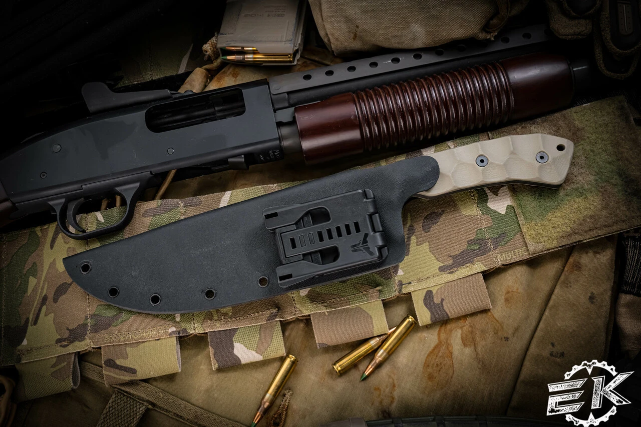 Each sheath is custom formed to its knife for maximum retention and comes with a belt clip that can be mounted left handed, right handed, vertical or horizontal.
