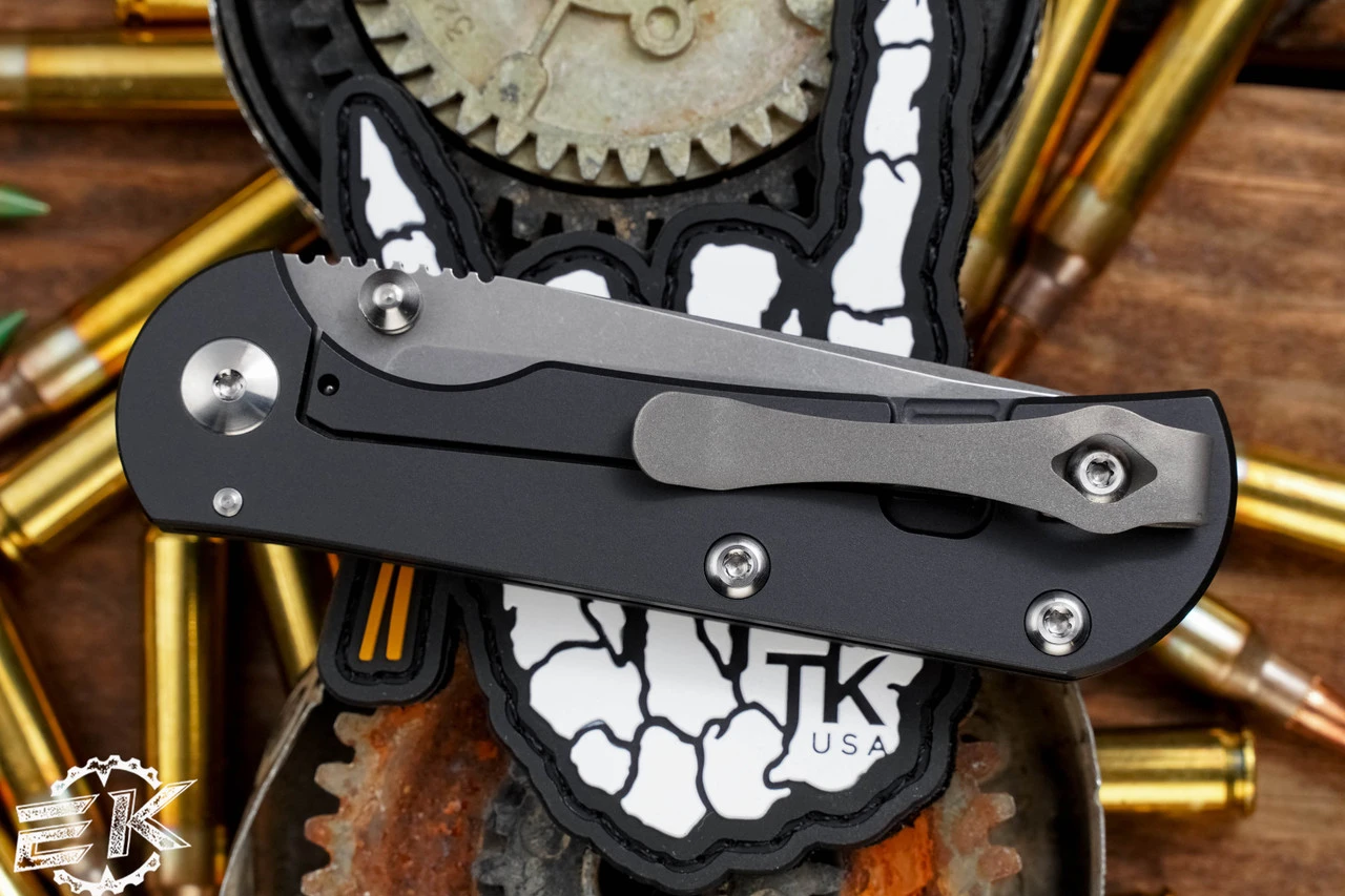 The Chasm rides on phosphor bronze washers for a smooth, controlled action, and the handles, hardware, and deep carry pocket clip on this midsize knife are all constructed from 6AL-4V titanium to ensure longevity and toughness. All colored handle options are finished with KG Gunkote, which provides excellent abrasion, chemical and impact resistance.