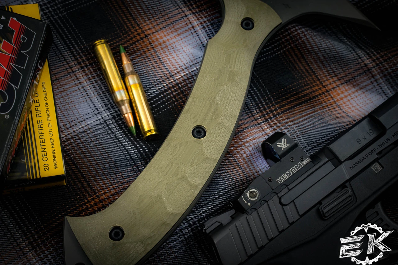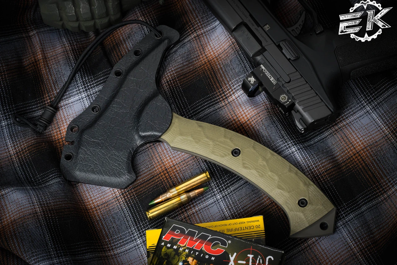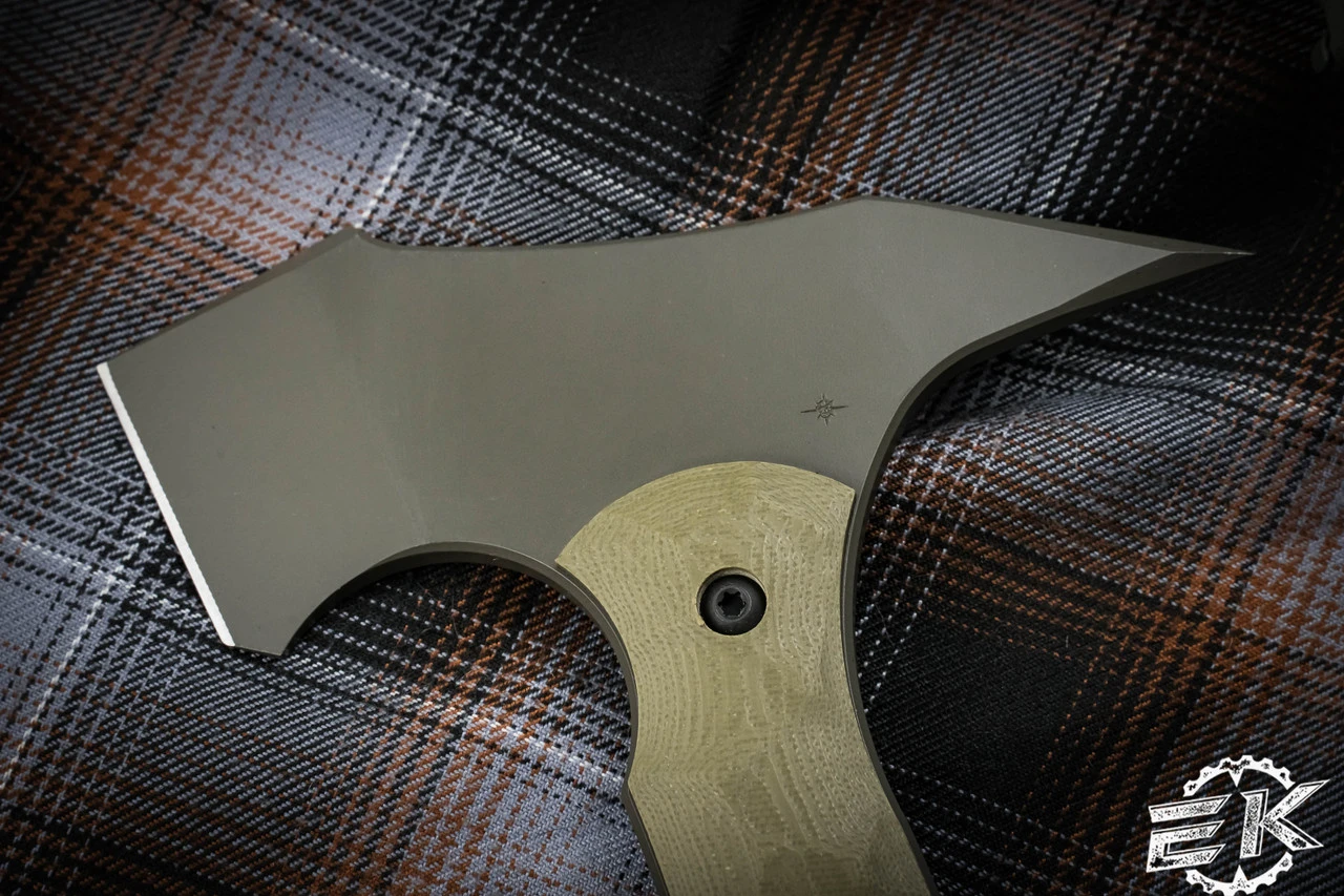 The F13 Tommy resembles traditional Native American Tomahawks, but Toor updated it with a tactical twist. Designed with a 90-degree point at the head of the axe, the F13 is the ideal breaching tool. The spike on the rear end of the axe head is extended to full tomahawk length giving the fingers plenty of room when striking with it. The 7” of handle length allows enough room for a two-handed grip, for increased swinging power, and the extremely durable G10 handle has a geometric texture carved into it for extra grip.
