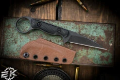 If you’re looking for a tactical blade and space is a premium on your gear, then this is the knife for you, as it’s slim line FlexTech sheath takes up minimal room. The Serpent’s 1 1/8” ring allows for an easy draw, with or without gloves. The blade is ground with a “Tanto” grind, leaving two razor sharp straight edges and at 3/16” thick, is just thick enough to be used as a prying tool, while thin enough to still slide through flesh.