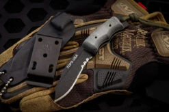 - 3″ black traction coated 1095 high carbon steel partially serrated blade.