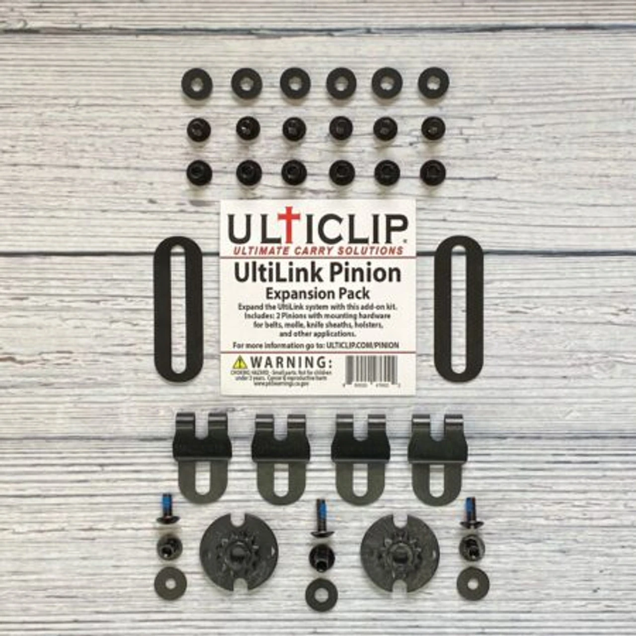 Includes: 2 Pinions with mounting hardware for belts, molle, knife sheaths, holsters, and other applications.